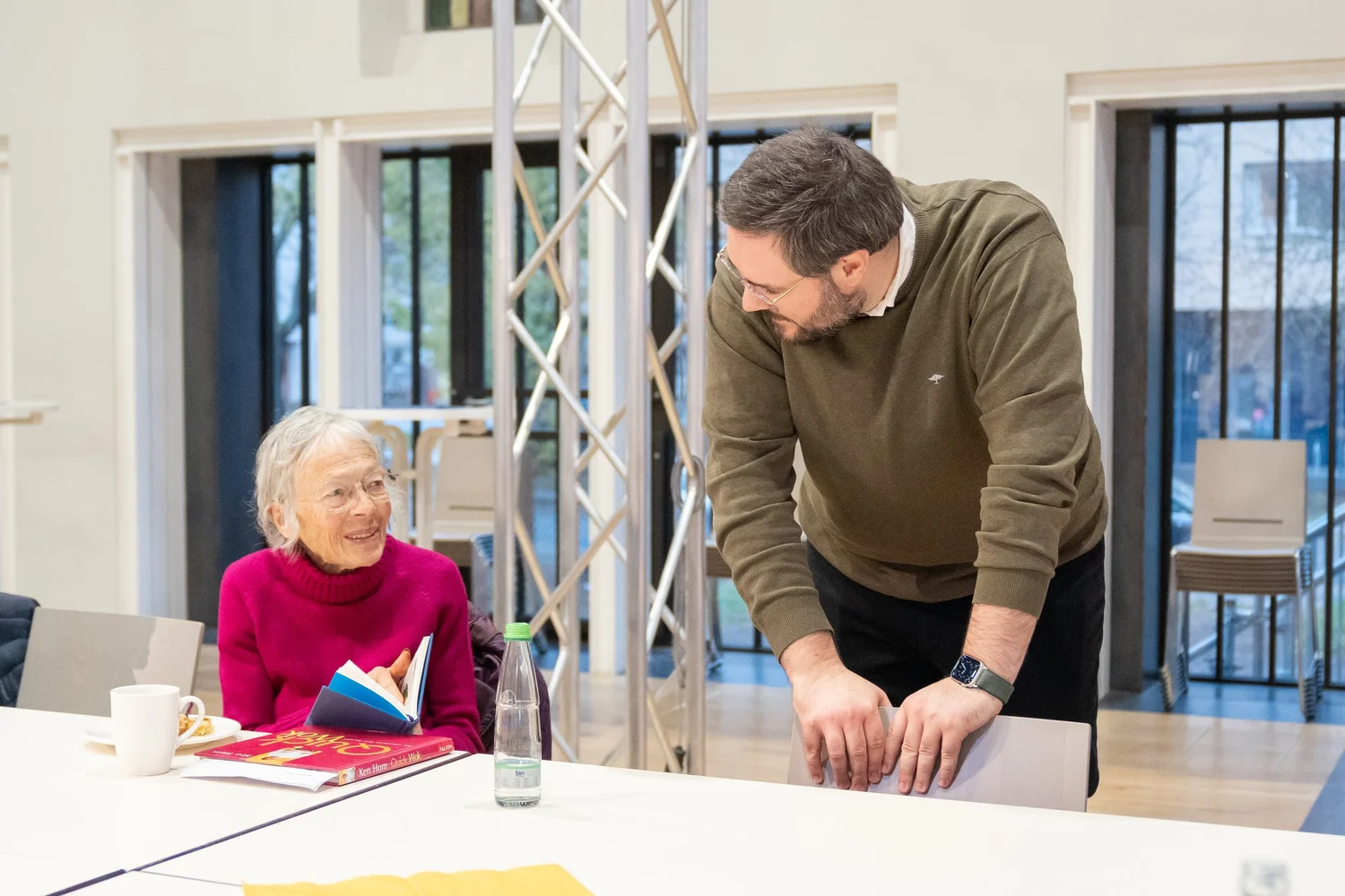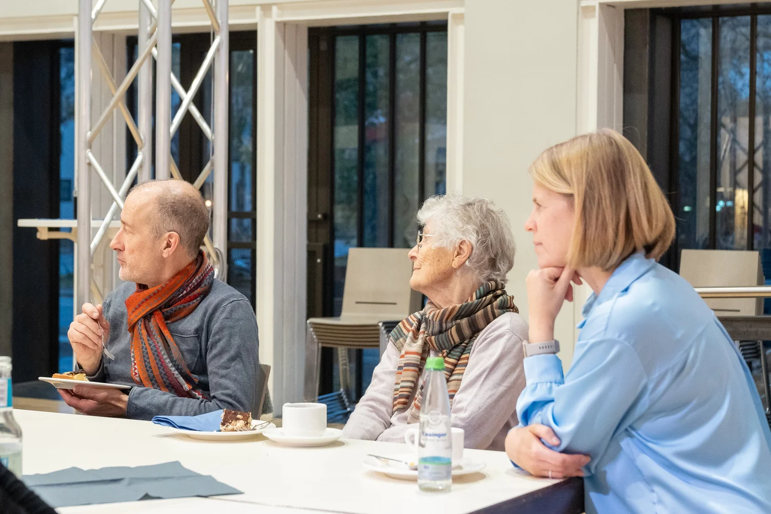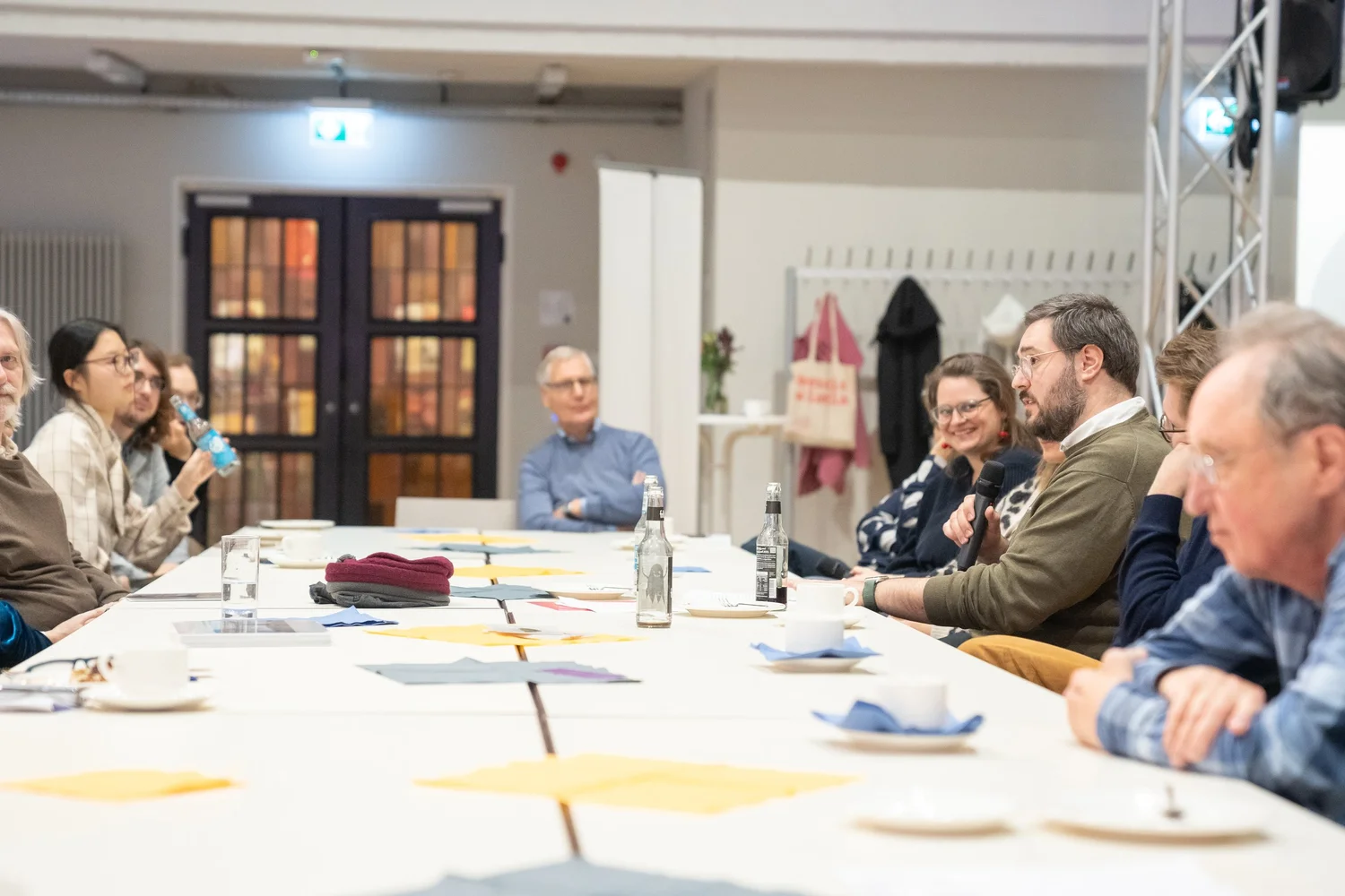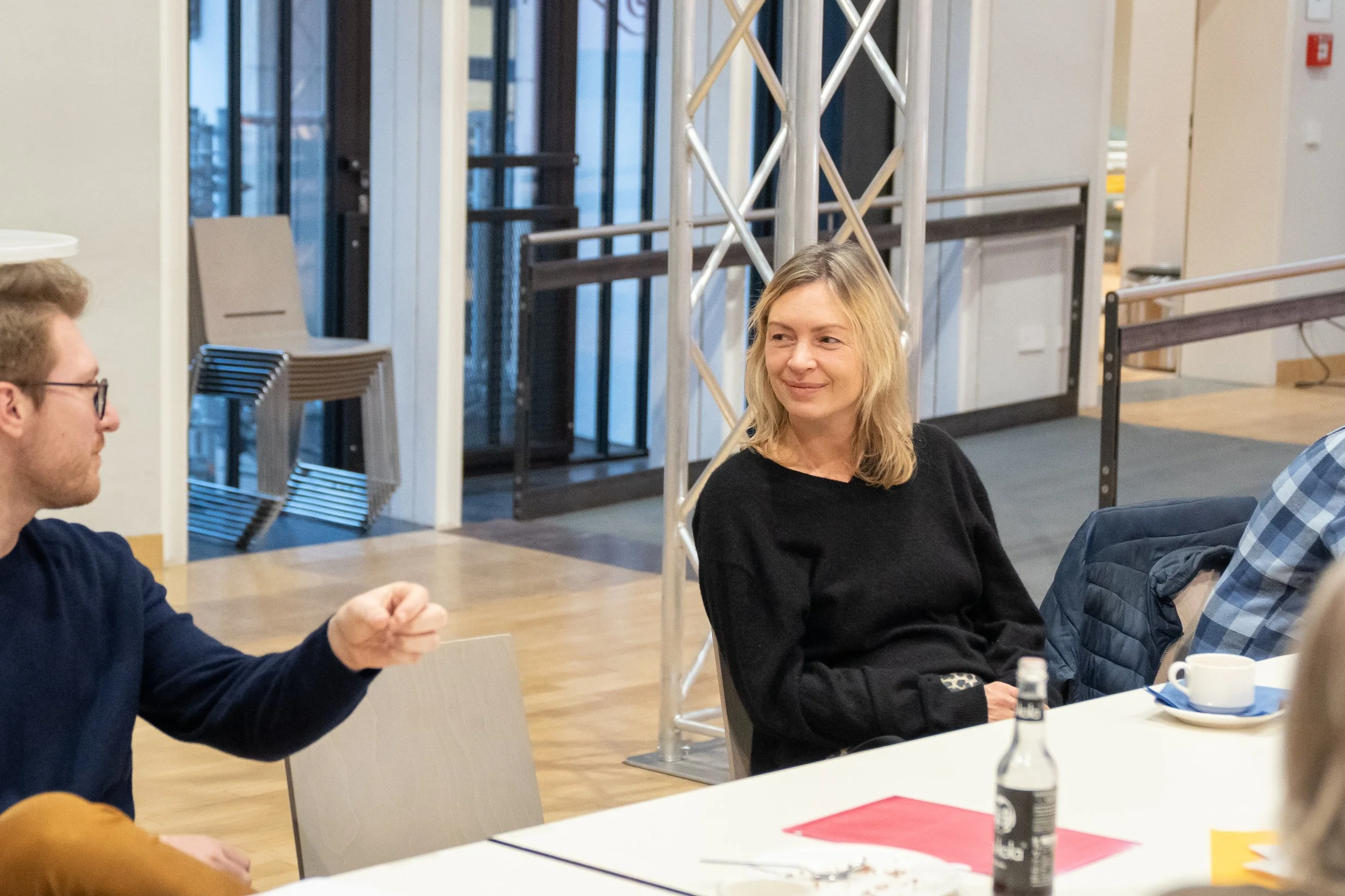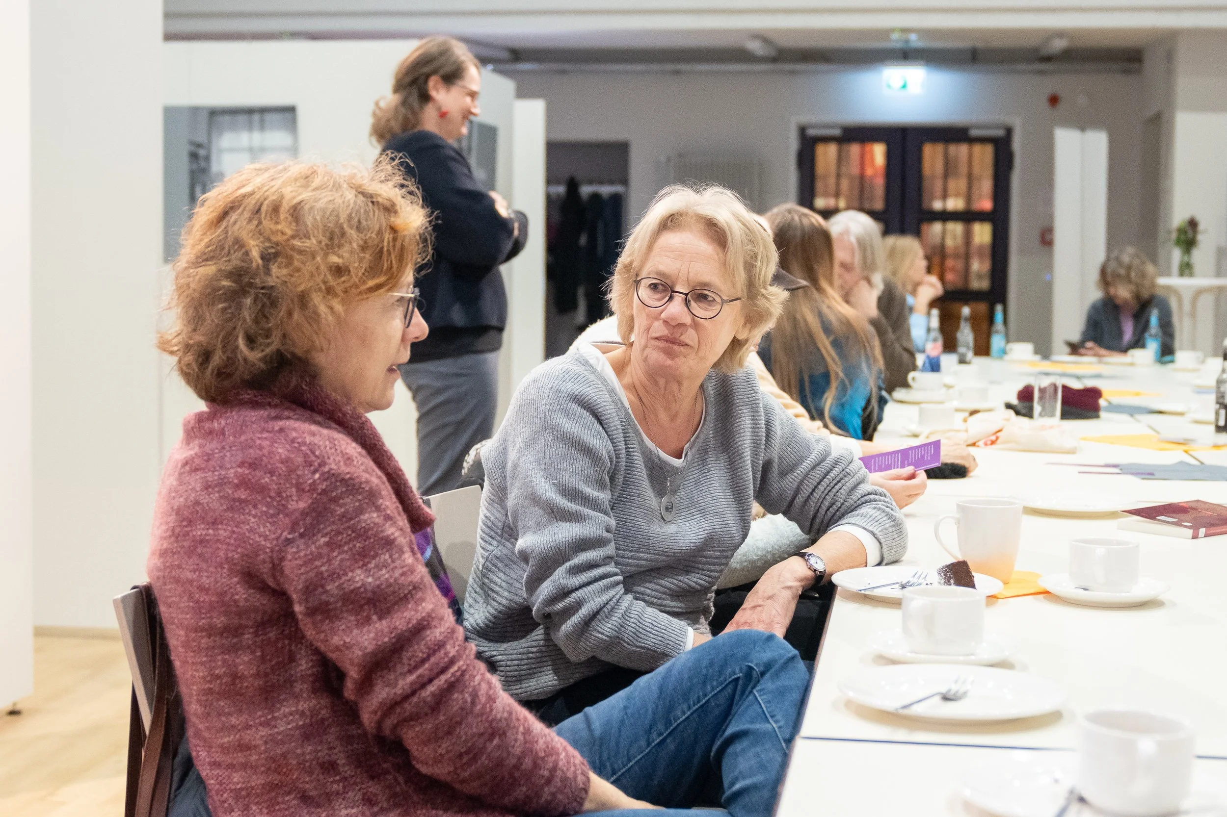 Die kurzen Lesungen unserer Autor:innen Sofie Morin, Anne Richter, Dennis Mizioch und uns (Charlotte Döhrmann & Jonas Spies) fanden in großer Kaffeerunde statt: direkt am Tisch und ohne weiteres Brimborium, außer rauen Mengen an Kuchen, den die Besucher:innen und Veranstalter:innen mitgebracht hatten. Wir haben es sehr genossen, mal keine große Differenz zwischen Lesenden und Hörenden zu spüren, sondern alle beisammen zu sitzen und die Literatur in die Alltagsgespräche einzustreuen. Ein wirklich warmer und herzlicher Novembernachmittag in dieser stimmungsvollen Location!
